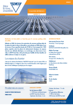 Le parking relais La Rose, conçu pour les usagers des transports en commun, a pour objectif de faciliter l’accès au centre-ville de Marseille. Lancés en 2020, les travaux se sont achevés en 2022 après deux années de chantier. Cet équipement moderne, d’une superficie de plus de 27 000 m², offre 1 000 places réparties entre stationnement classique, bornes pour véhicules électriques, emplacements dédiés au covoiturage, aux deux-roues et aux vélos. L’ouvrage se distingue par son habillage en fines lamelles de BFUP Smart-Up, qui lui confère une architecture contemporaine et singulière.