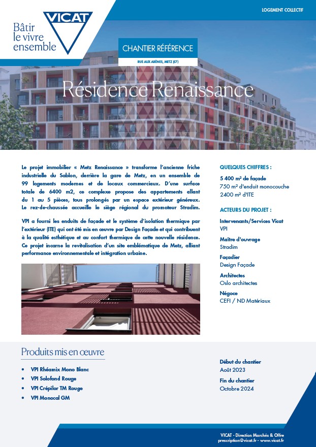 Pour répondre aux exigences techniques, esthétiques et énergétiques du chantier de la résidence Renaissance, une sélection sur-mesure de produits VPI a été mise en œuvre. Cette combinaison de solutions a permis d’apporter une réponse complète et cohérente aux différents types de façades du projet.