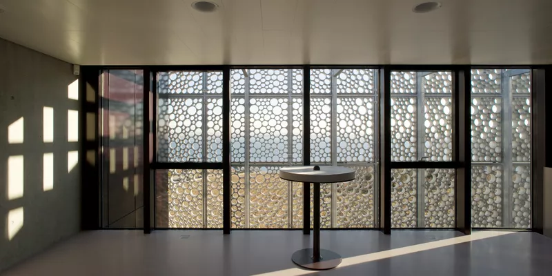 Implantée à Corcelles-Cormondrèche, au cœur des vignobles suisses, l’usineDress Your Body du Swatch Group affirme une vision architecturale à la fois audacieuse et durable. Imaginée par l’agence ATELIER ÏO entre 2006 et 2007, cette unité de production dédiée à la fabrication de bijoux pour la marque Swatch se singularise par une façade emblématique. Composée de 300 panneaux préfabriqués en BFUP Smart-Up, ajourés à plus de 80 %, celle-ci s’inspire d’un motif alvéolaire. Cette enveloppe légère dialogue avec la lumière naturelle, générant des effets de transparence et de densité qui se transforment au rythme de la journée et des saisons.